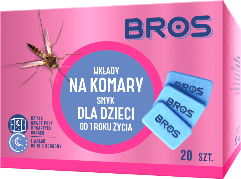 Płyn owadobjczy do stosowania z elektrofumigatorem BROS do zwalczania komarów. Zapewnia skuteczną ochronę przed komarami i innymi owadami latającymi. Produkt może być stosowany w pokojach, gdzie przez dłuższy czas przebywają dzieci powyżej 1 roku życia. Włączenie urządzenia do kontaktu powoduje parowanie substancji, która zwalcza owady znajdujące się już w pomieszczeniu oraz zapobiega ich nadlatywaniu z zewnątrz. Kolorystyka urządzenia pasuje do wystroju dziecięcych pokoi.