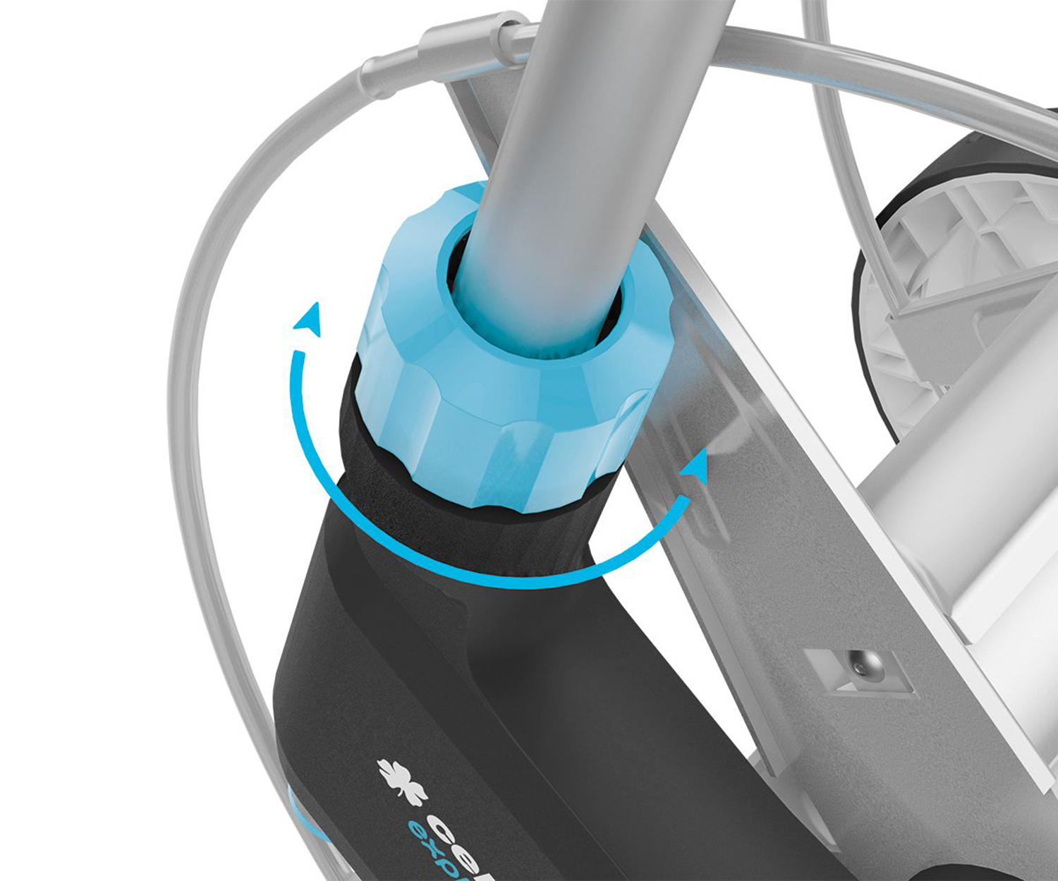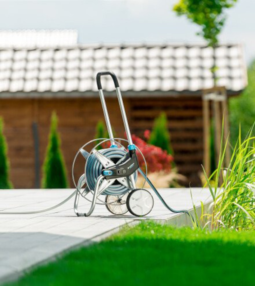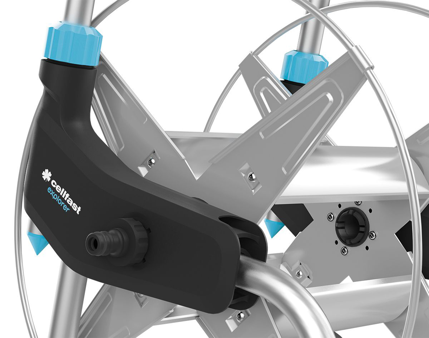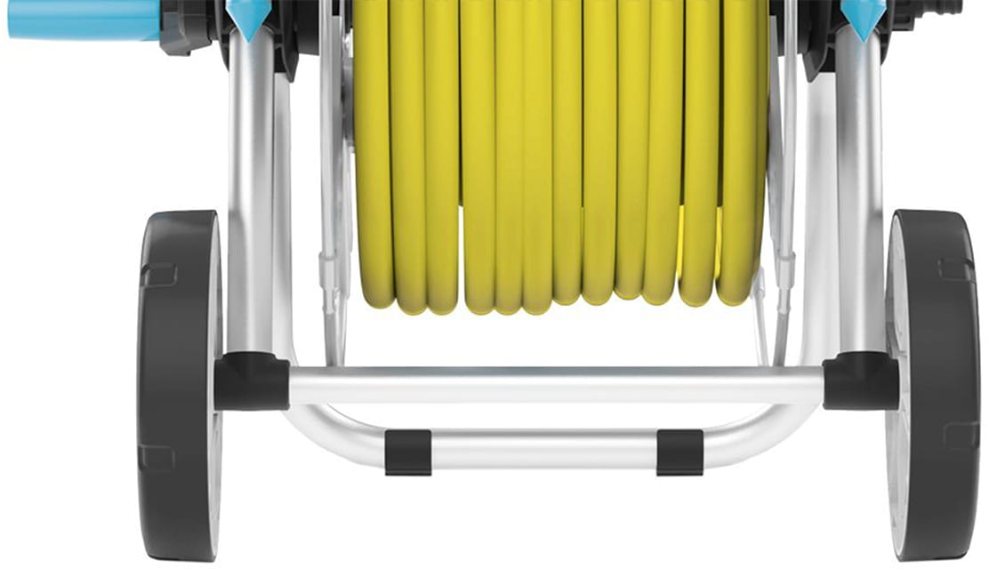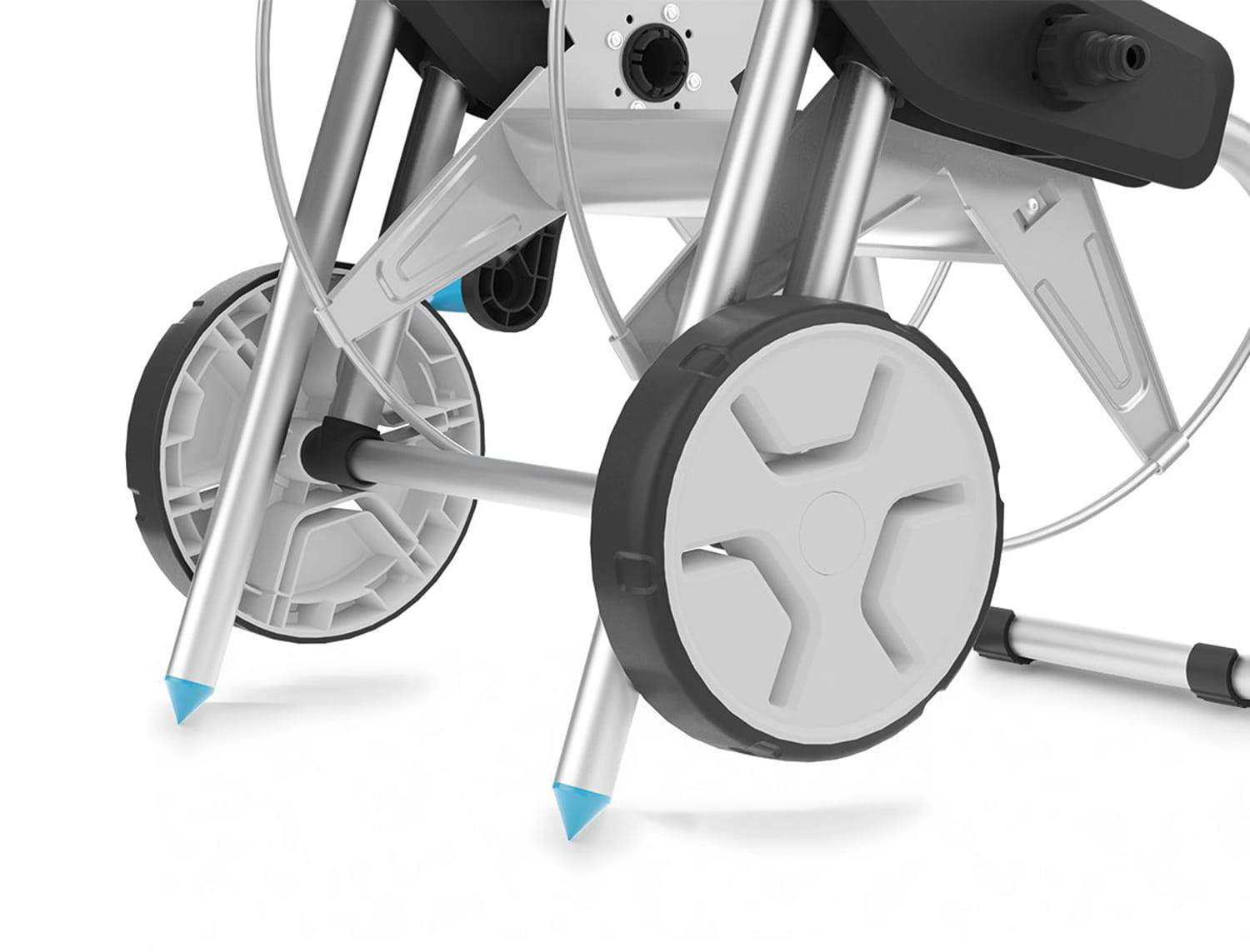 Wbijane nóżki zapewniają stabilność wózka w trakcie rozwijania węża. Dodatkowo gwarantują bezpieczne użytkowanie oraz ułatwiają szybki zwijanie węża.