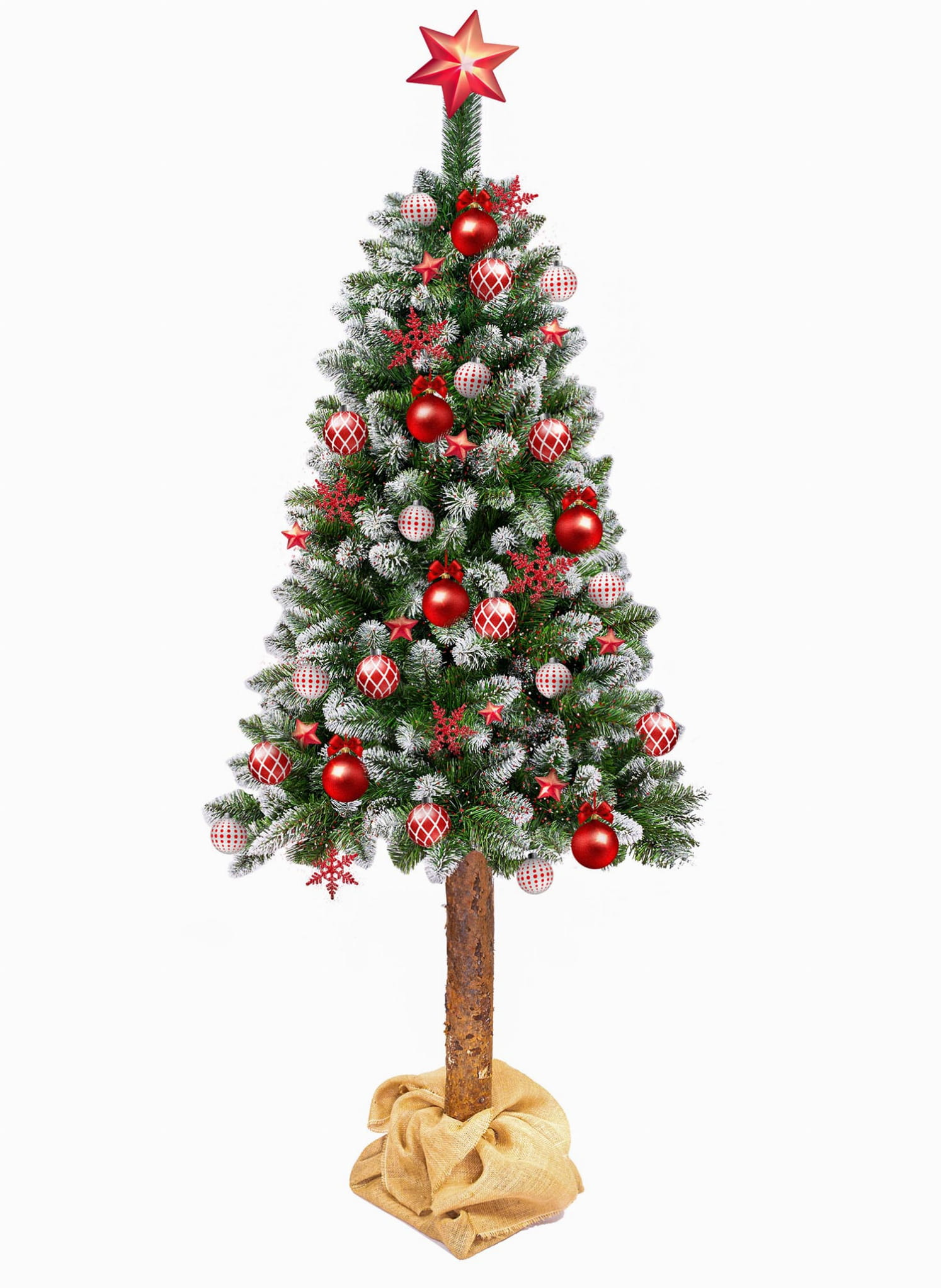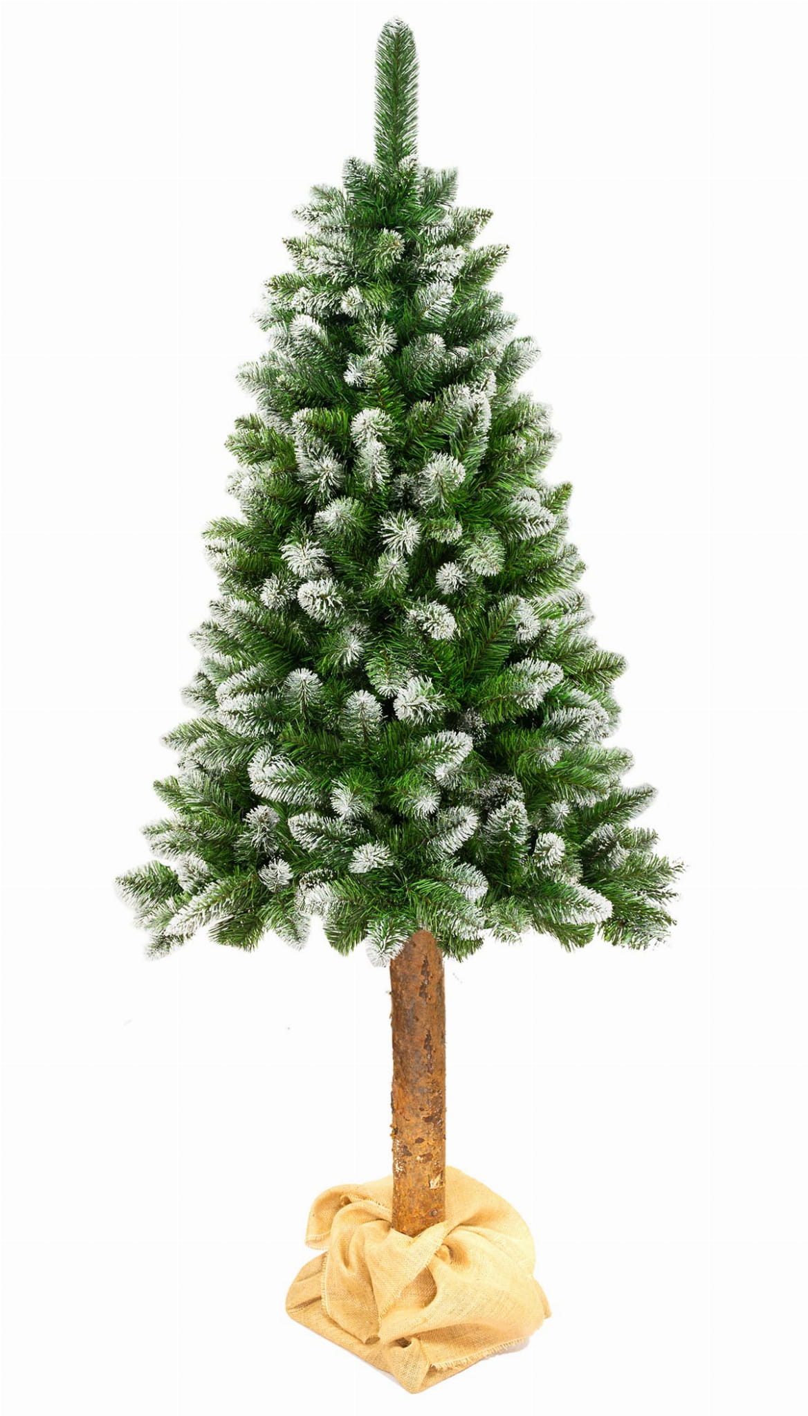 Choinka we wzorze SOSNA DIAMENTOWA NA PNIU składa się z gęstej korony osadzonej na naturalnym sosnowym pniu. Całość stoi na stabilnej, czteroramiennej podstawie owiniętej naturalnym materiałem jutowym.