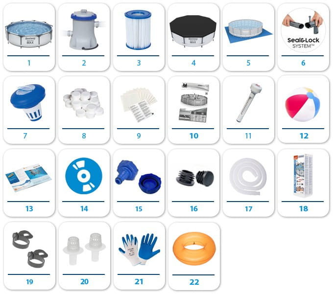 Nasz zestaw posiada wszystkie niezbędne akcesoria takie jak sitka, zaciski, zaślepki, spust wody itp., które pozwolą na łatwe rozłożenie basenu jak i jego złożenie, a także ułatwią codzienne użytkowanie basenu