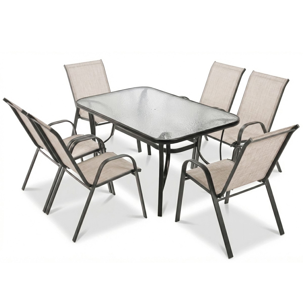 Zestaw mebli ogrodowych Bistro (stół i 6 krzeseł) to połączenie elegancji i nowoczesności, które odmienią Twój ogród. Ponadczasowy czarny kolor stelażu połączony z beżowymi obiciami krzeseł i stylowe wykończenie sprawiają, że ten komplet prezentuje się wyjątkowo gustownie w każdej aranżacji. Minimalistyczna forma idzie w parze z finezyjnymi detalami – szklany blat stołu o dekoracyjnej fakturze mozaiki dodaje szyku i przyciąga wzrok. Zestaw Bistro zamieni Twoją przestrzeń na świeżym powietrzu w elegancki salon pod gołym niebem, imponując gościom i ciesząc oko domowników. Dopasowane stylistycznie krzesła i stół tworzą harmonijną całość, która wniesie do Twojego otoczenia odrobinę luksusu.