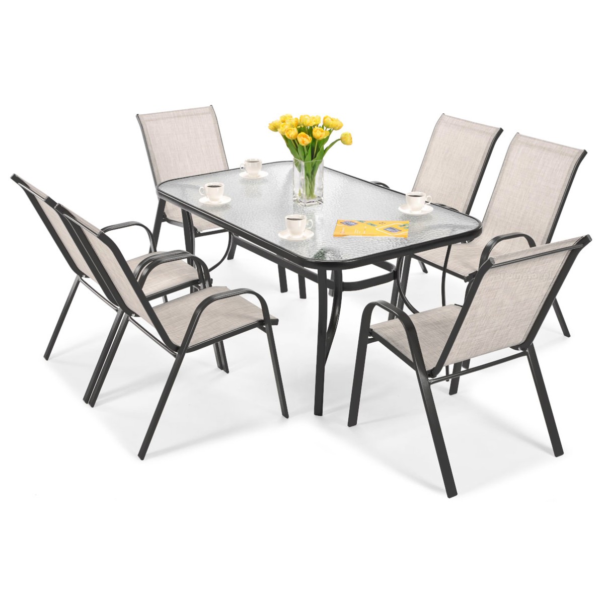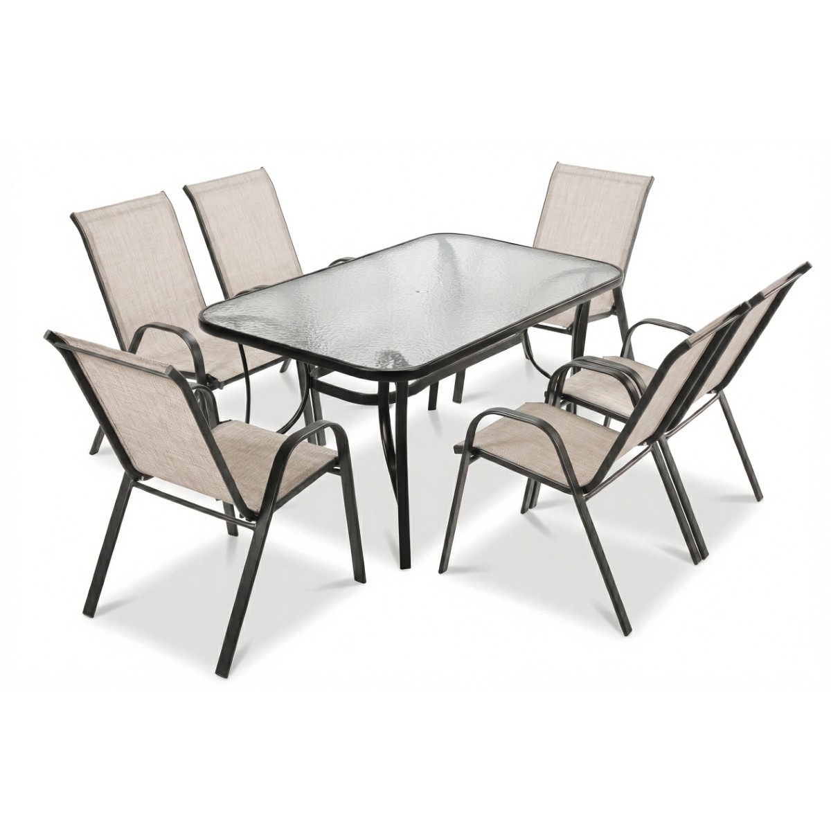 Zestaw Mebli Ogrodowych Bistro ( Stół + 6 Krzeseł ) - Czarny Stelaż, Beżowe Obicie