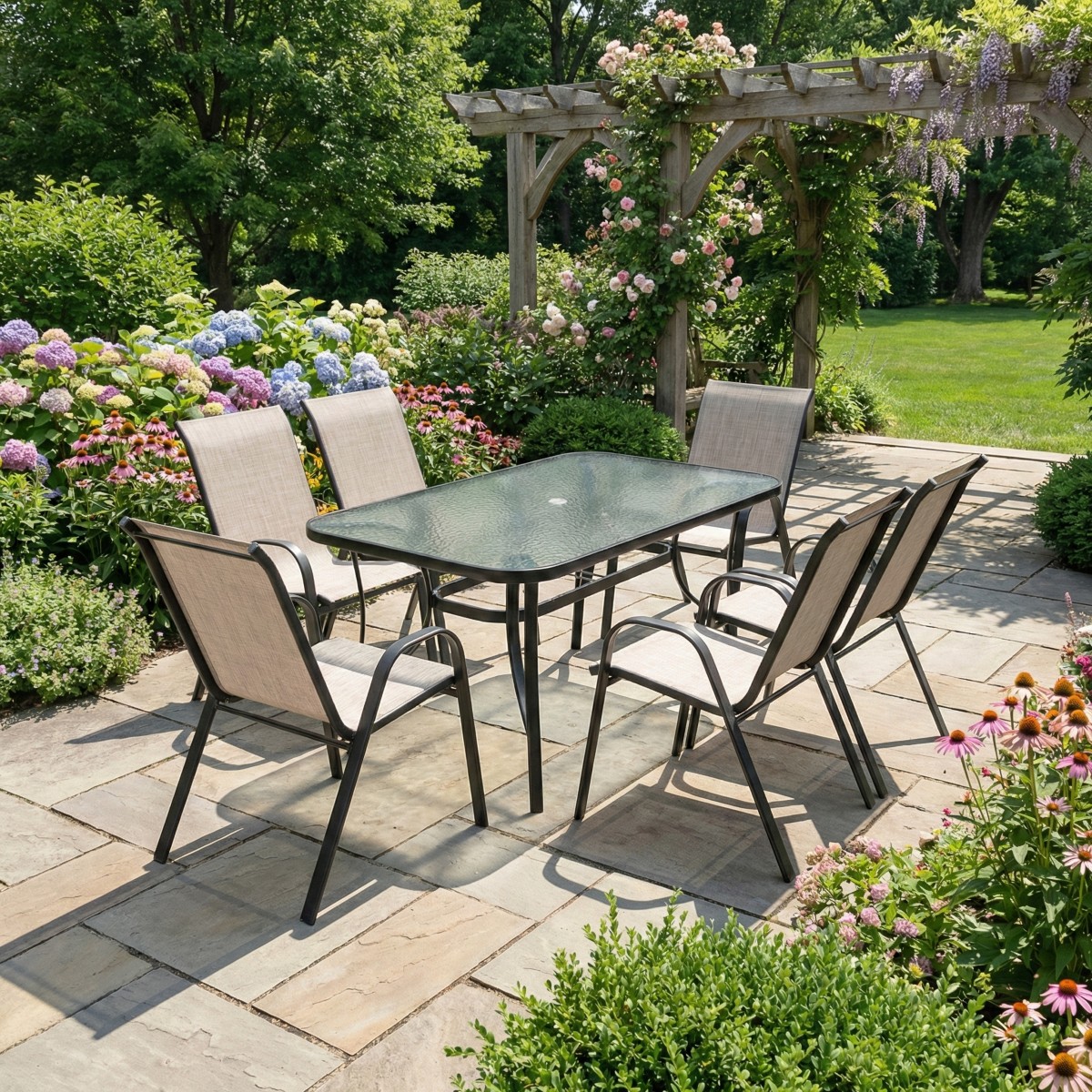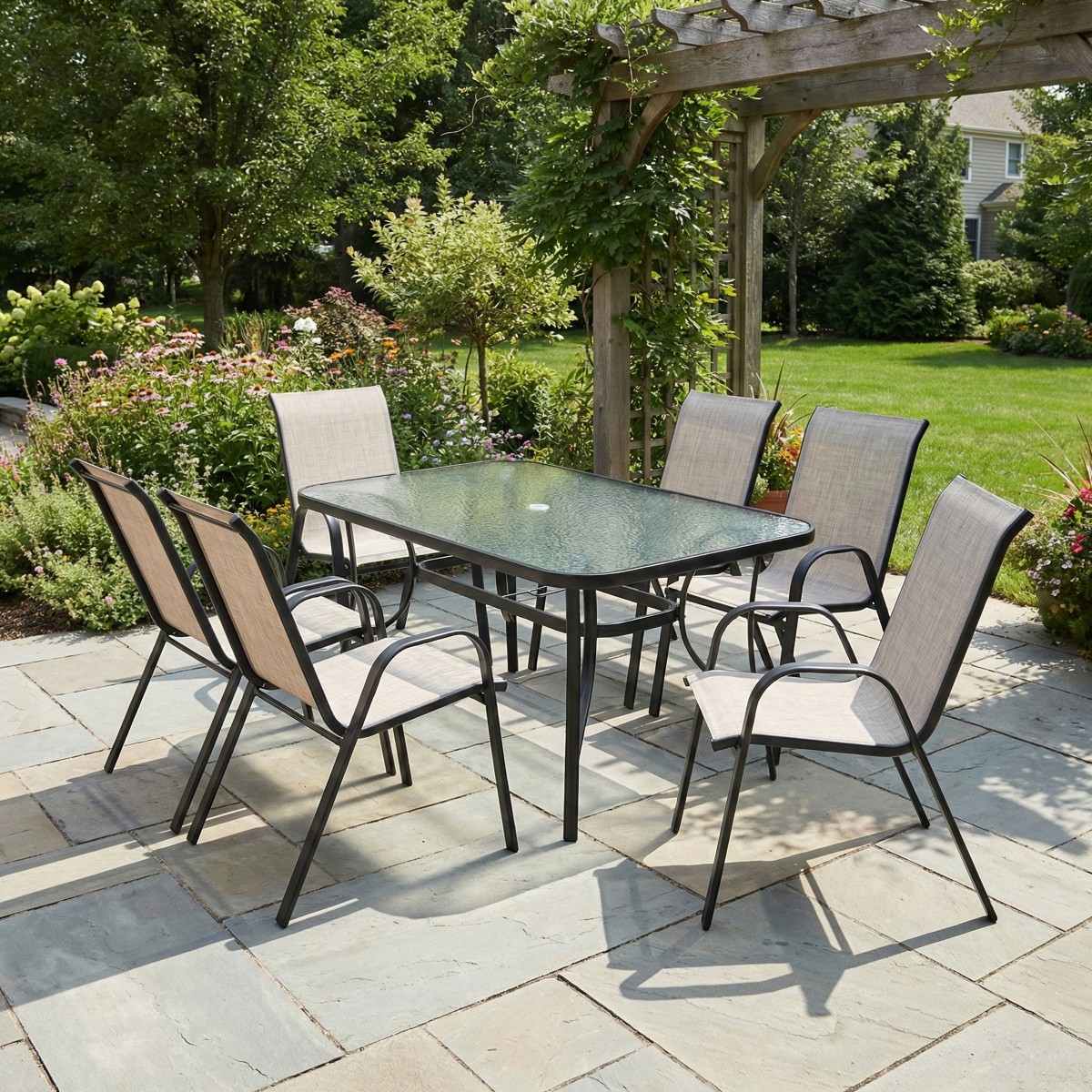 Centralnym punktem zestawu jest solidny stół ogrodowy, łączący nowoczesny styl z wyjątkową funkcjonalnością. Jego duży, prostokątny blat z hartowanego szkła o unikatowej strukturze mozaiki zapewnia mnóstwo miejsca na posiłki i dekoracje, a przy tym dodaje elegancji całemu zestawowi. Hartowane szkło jest nie tylko efektowne, ale też bezpieczne i łatwe do czyszczenia – ewentualne zabrudzenia wystarczy przetrzeć wilgotną ściereczką. Dzięki wzmocnionej ramie ze stali malowanej proszkowo stół stoi niezwykle stabilnie, nawet gdy jest w pełni zastawiony daniami podczas przyjęcia.